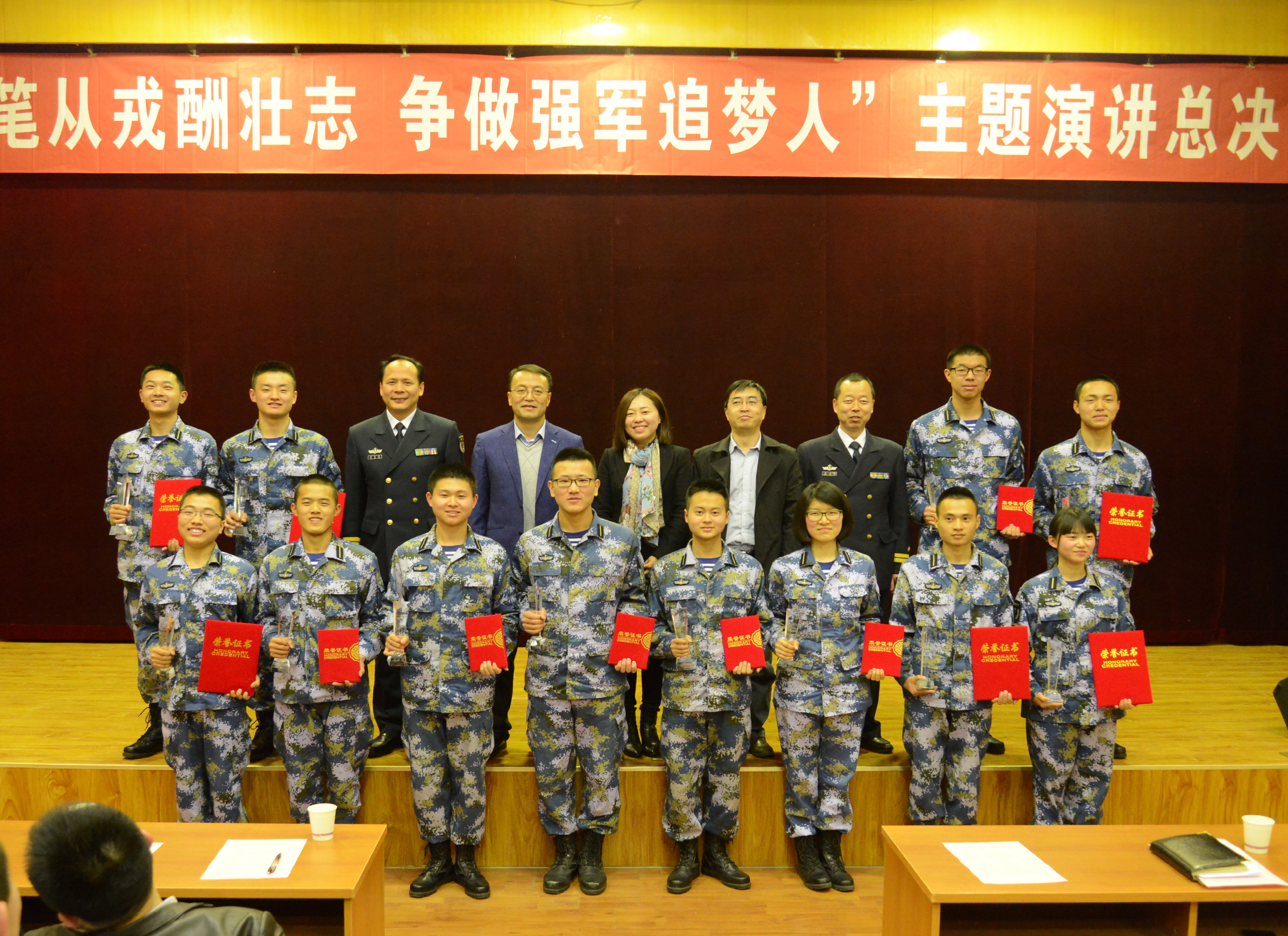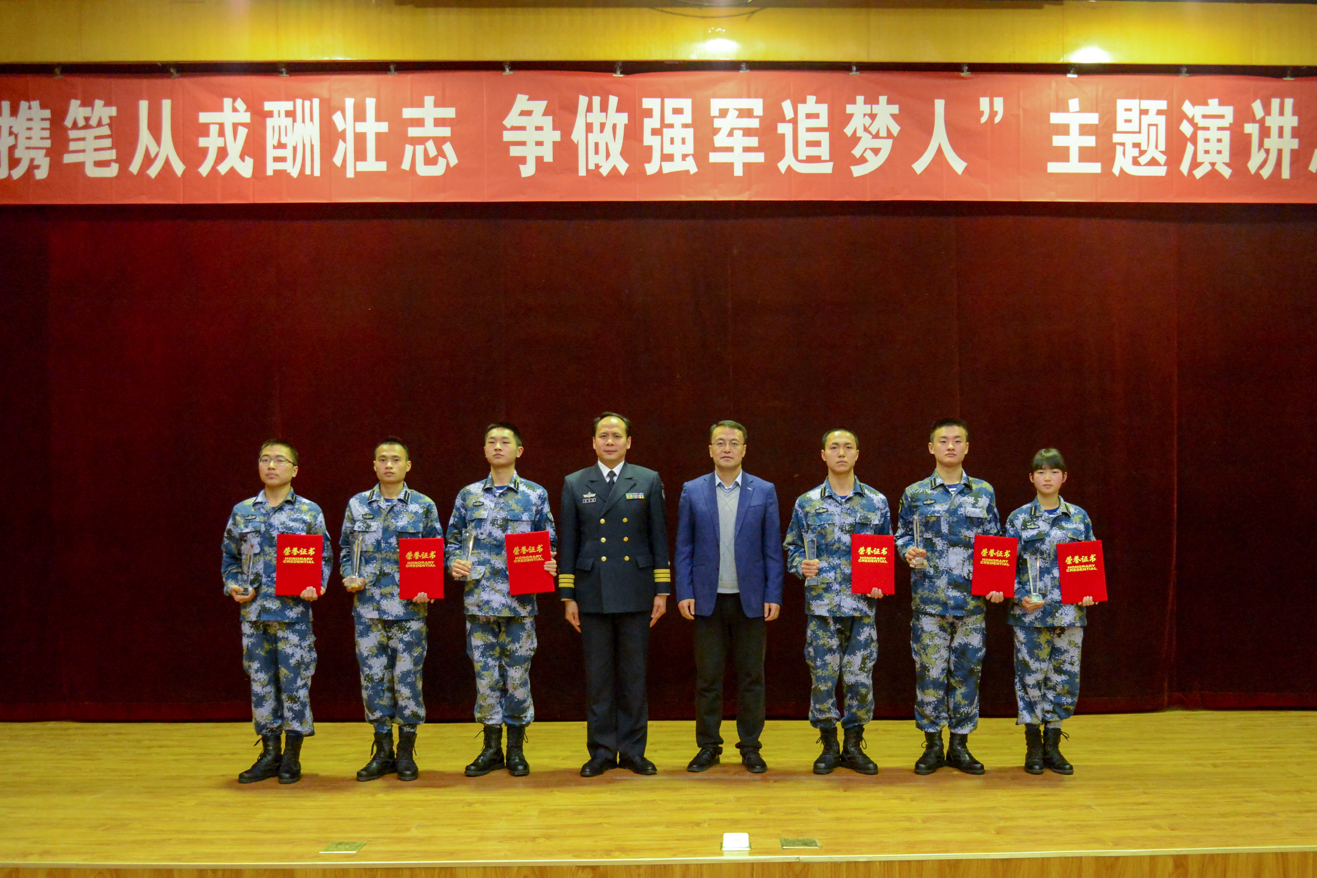 最后,与会领导为获奖选手颁发荣誉证书与奖杯并合影留念,大赛圆满落幕。本次比赛达到了全员参与、以赛促训的目的,打牢了学员携笔从戎、强军报国、投身军改的思想根基,提升了思维层次,加强了书面写作和临场应变能力,为学员赴部队履职积累了才干,增添了信心。