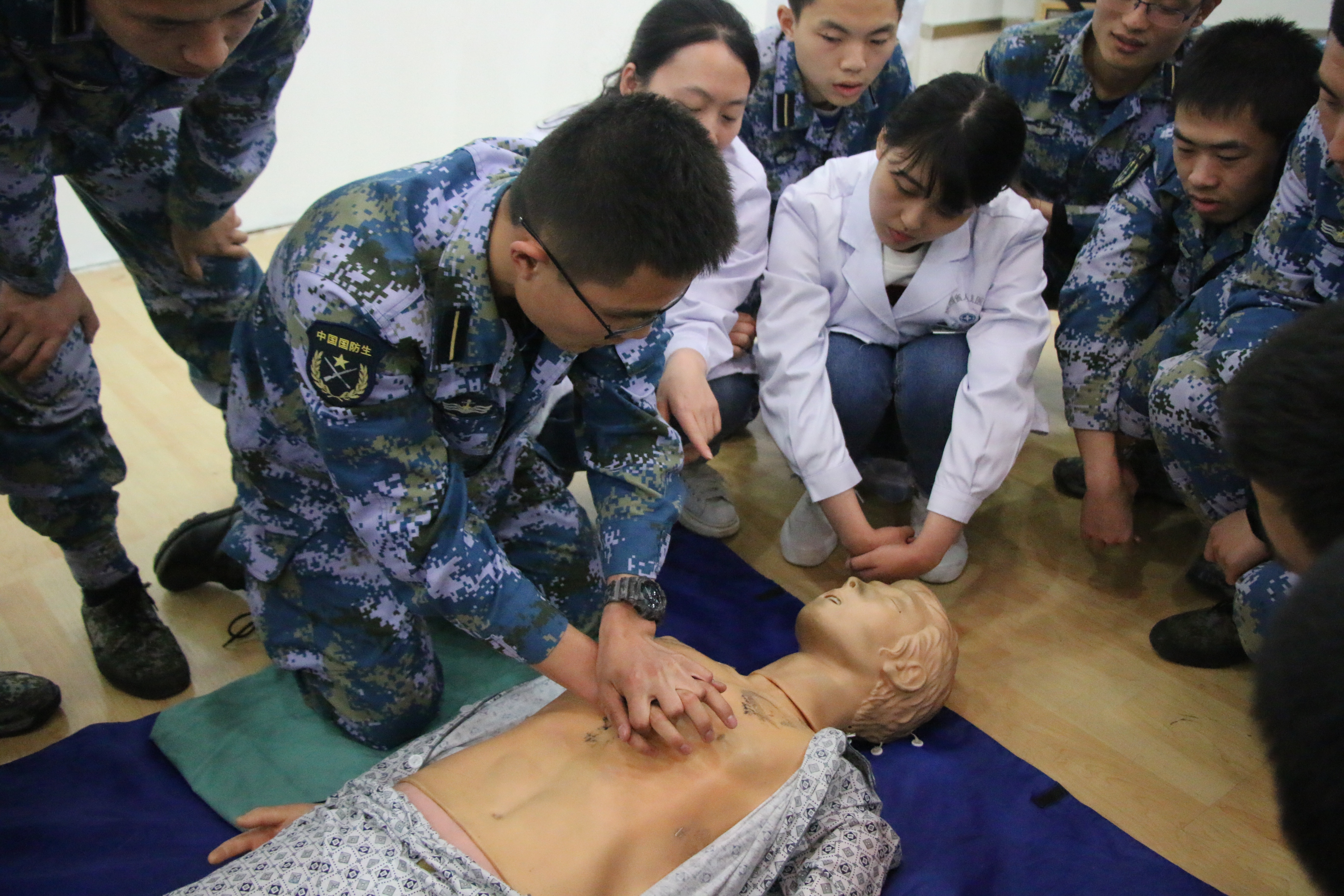 接着开始了本次急救教学的主要内容,包括急救原则、急救特点、急救基本要求、急救流程、心肺复苏等方面。常建华主治医师为我们深入浅出的介绍,辅以生动的图文讲解,使在场国防生在愉快活跃的气氛中掌握了许多与急救相关的知识,同时医生们还对急救技能进行现场示范性操作,使大家对急救有了进一步实践层次的体会。