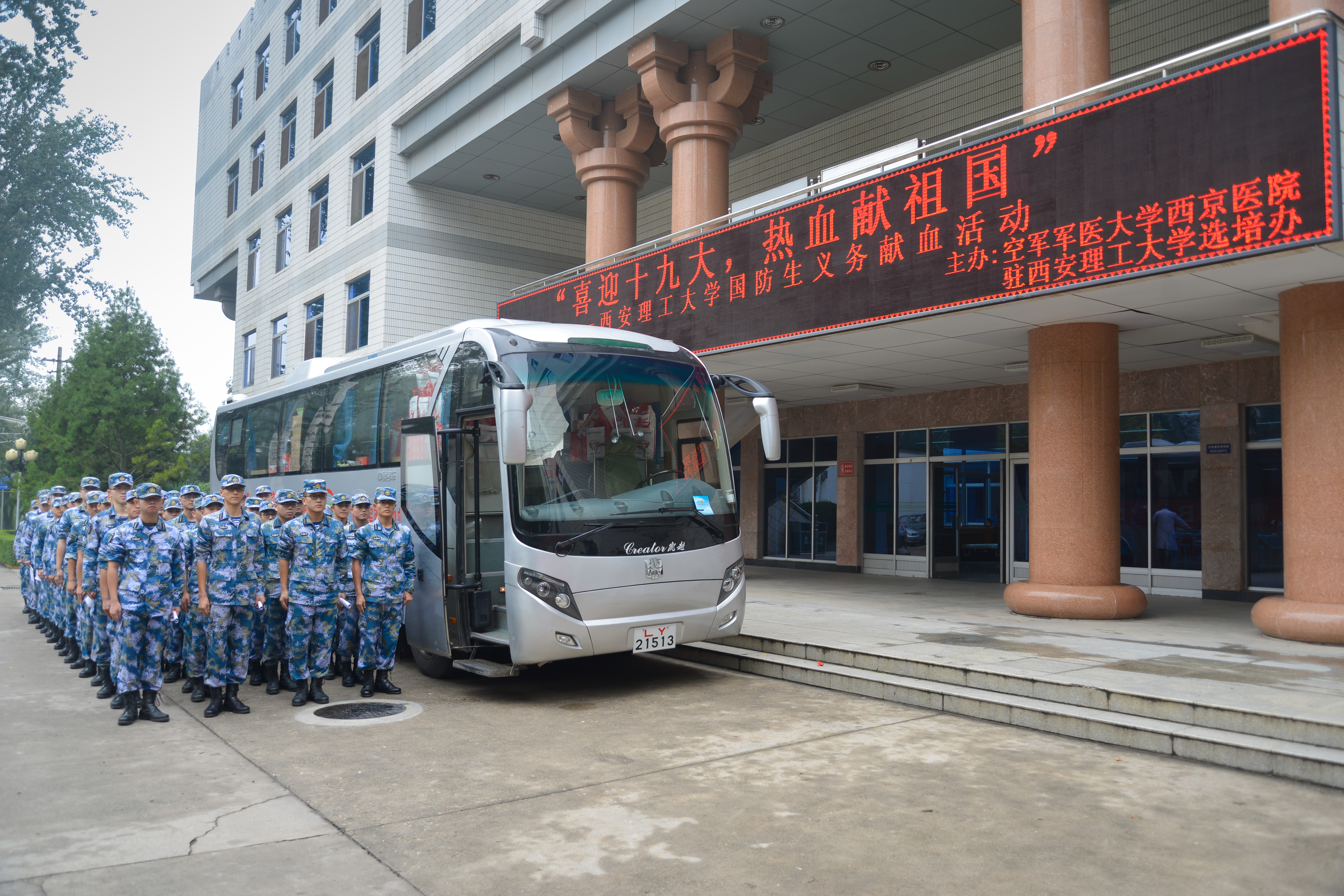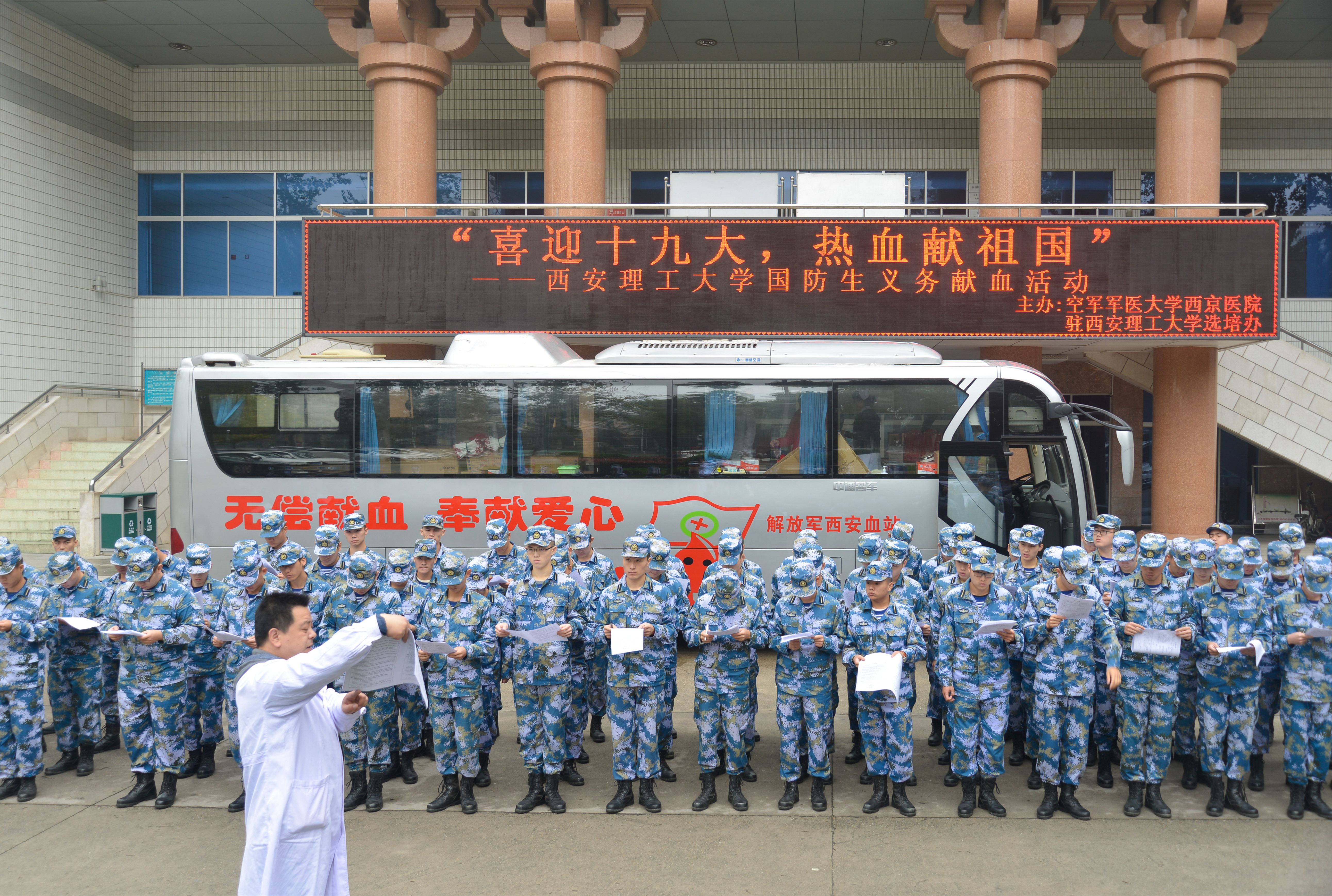 在党的十九大胜利召开前期,驻校选培办先后组织国防生参加了陕西省烈士公祭仪式、开展主题读书活动、观看《强军》纪录片、主题教育、专题辅导等一系列活动后,近日又联合空军军医大学西京医院,组织全体国防生开展“喜迎十九大,热血献祖国”义务献血活动,在为祖国人民奉献爱心的同时,进一步激发学员的爱国热情和使命意识,凝聚强军力量,砥砺战斗精神,用实际行动迎接党的十九大胜利召开。