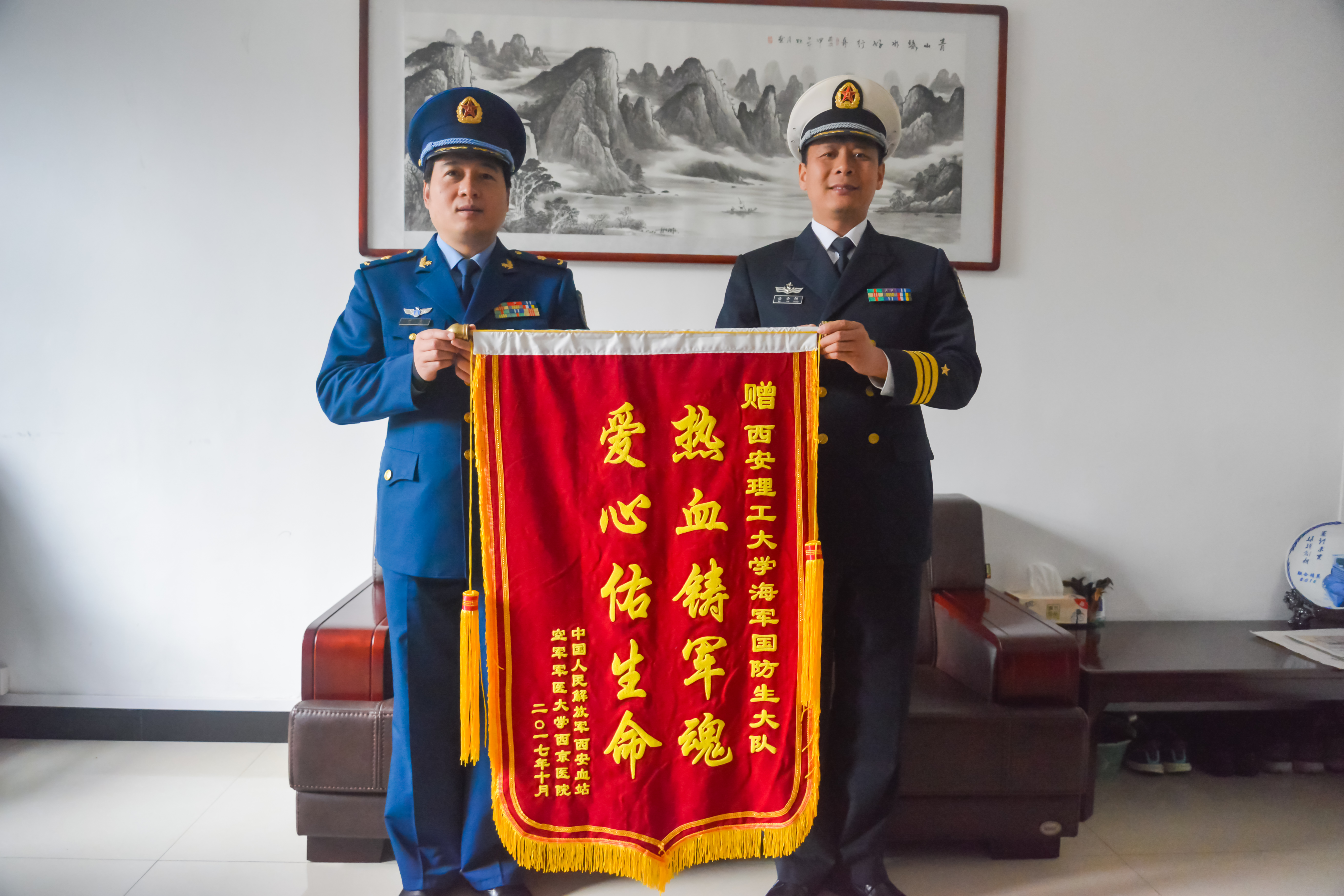 献血活动后,空军军医大学西京医院专程送来锦旗,表达对我校国防生爱心行动的谢意,并对学员良好素质和优良作风给予了高度评价!