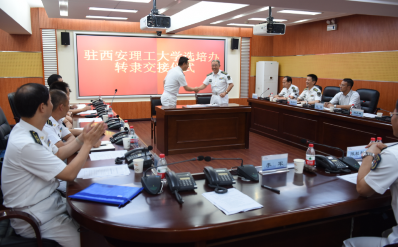 仪式上,海参训练局选培办主任陈德洪宣读了海军关于转隶移交的通知,北海舰队参谋部训练处、海装西安局政治部分别代表接收方与移交方在交接书上签字,驻校选培办主任徐金洲作了表态发言,海军、舰队机关有关业务部门领导分别作了重要讲话,并对转隶后的国防生培养工作提出了要求和希望。仪式结束后,与会人员观看了西安局装备建设汇报片,参观了武器装备展厅,并合影留念。